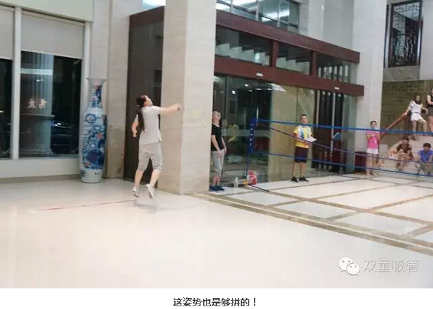 候場(chǎng)的選手們也不閑著,拿上球拍先到外面練練手,一時(shí)間室內(nèi)室外都聚集了羽毛球愛好者,咱們的“雙童”寶貝們見此也是閑不住啦!“讓我也試試!”,哎呀,這球打的還真不賴呢!