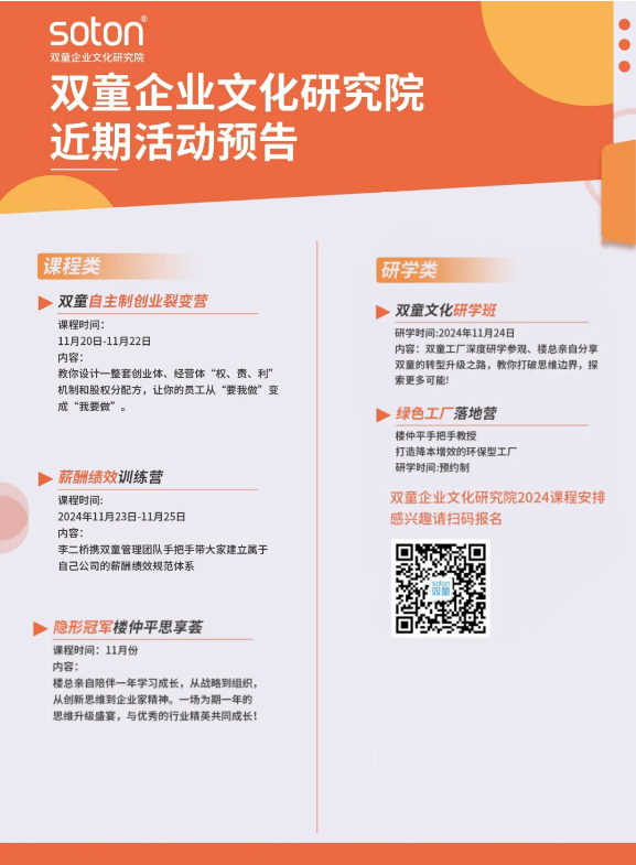 如果你也對“雙童”充滿好奇,也想賦能團隊共同成長,歡迎走進11月24日【雙童文化研學班】,與上百位優(yōu)秀的創(chuàng)業(yè)者一起學習!少量名額,歡迎咨詢鎖定!