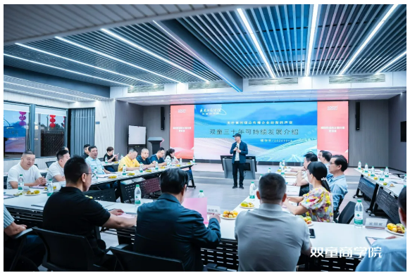 在座談會(huì)環(huán)節(jié),雙童創(chuàng)始人樓仲平向來訪者分享了《雙童三十年可持續(xù)發(fā)展介紹》主題課程,介紹了企業(yè)發(fā)展現(xiàn)狀、未來目標(biāo)及公益方面所做的工作。