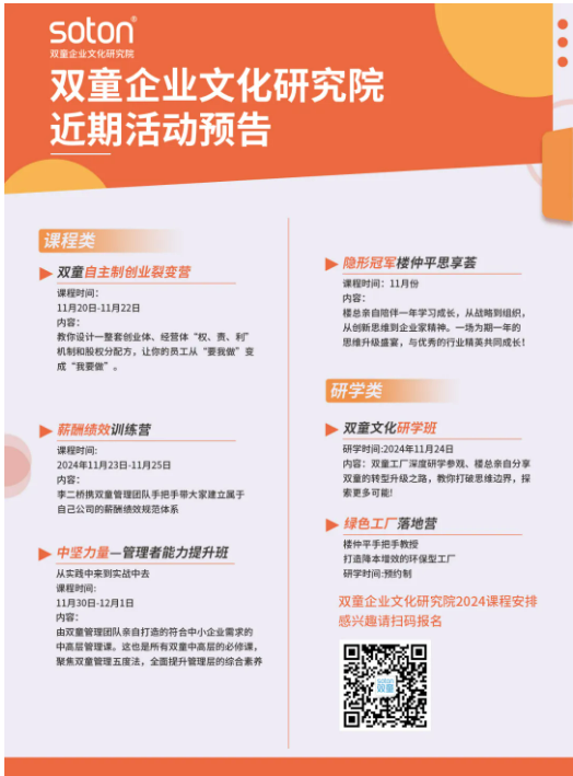 如果你也對“雙童”充滿好奇,也想賦能團(tuán)隊(duì)共同成長,歡迎走進(jìn)11月24日【雙童文化研學(xué)班】,與上百位優(yōu)秀的創(chuàng)業(yè)者一起學(xué)習(xí)!少量名額,歡迎咨詢鎖定!