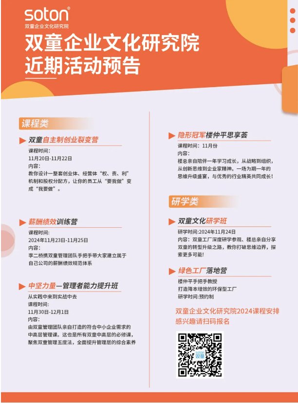 如果你也對“雙童”充滿好奇,也想賦能團(tuán)隊(duì)共同成長,歡迎走進(jìn)11月24日【雙童文化研學(xué)班】,與上百位優(yōu)秀的創(chuàng)業(yè)者一起學(xué)習(xí)!少量名額,歡迎咨詢鎖定!