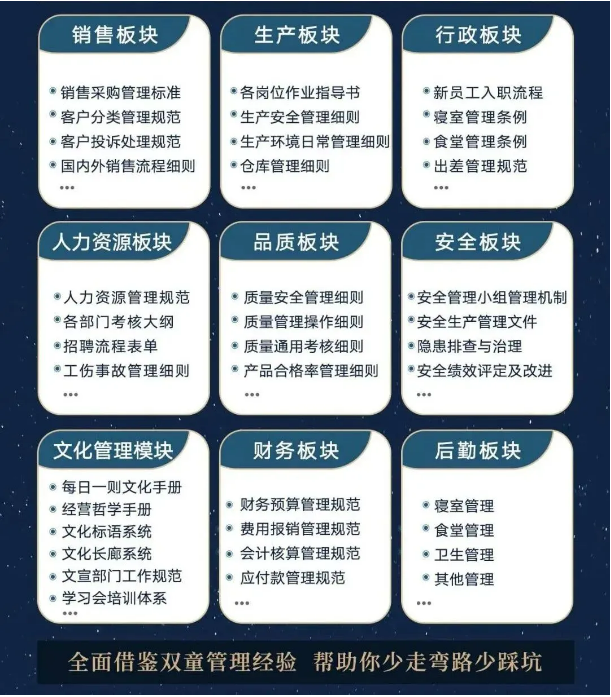 所以,入學“隱形冠軍樓仲平思享薈”之后,項目組會將“雙童”積累了30年、包含了銷售、生產、行政、人類資源、品質、安全、文化管理、財務和后勤等9大板塊,600份管理規(guī)范文件,全部打包給學員,幫助學員企業(yè)能夠全面借鑒雙童管理經驗、少走彎路、少踩坑!