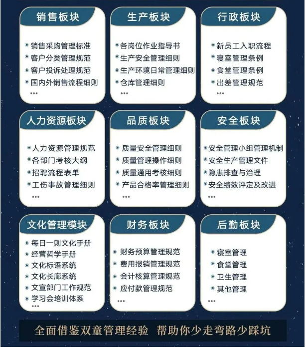 所以,入學(xué)“隱形冠軍樓仲平思享薈”之后,項(xiàng)目組會(huì)將“雙童”積累了30年、包含了銷售、生產(chǎn)、行政、人類資源、品質(zhì)、安全、文化管理、財(cái)務(wù)和后勤等9大板塊,600份管理規(guī)范文件,全部打包給學(xué)員,幫助學(xué)員企業(yè)能夠全面借鑒雙童管理經(jīng)驗(yàn)、少走彎路、少踩坑!