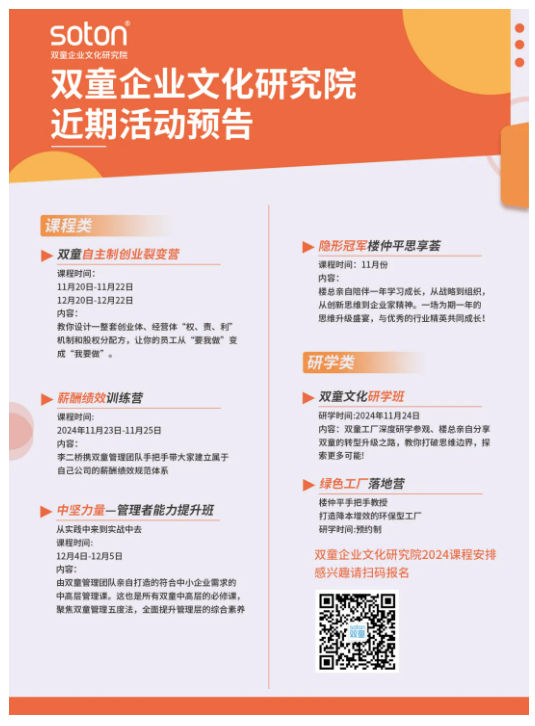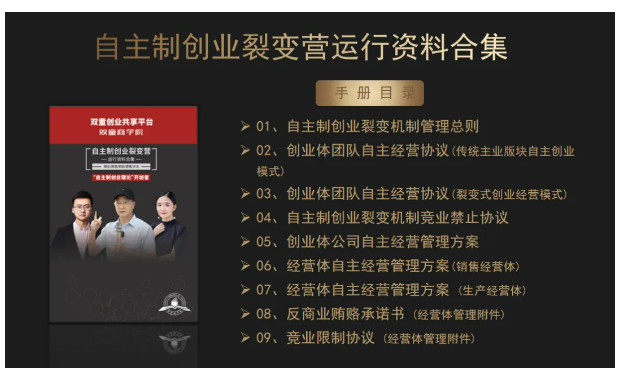 雙童創(chuàng)始人樓仲平更是閉關(guān)3個(gè)月,親自執(zhí)筆編撰了20多萬字《自主制創(chuàng)業(yè)裂變營運(yùn)營資料合集》,作為裂變機(jī)制在企業(yè)內(nèi)推行的指導(dǎo)文本,濃縮了雙童20多年的科學(xué)管理經(jīng)驗(yàn)和操作方法,以及創(chuàng)業(yè)體、經(jīng)營體制定的實(shí)操方案,幫助學(xué)員企業(yè)能夠全面借鑒雙童管理經(jīng)驗(yàn)、少走彎路、少踩坑!