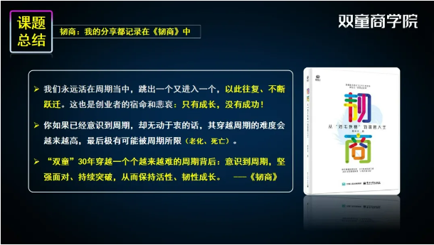 雙童30年穿越一個個越來越難的周期背后,是創(chuàng)始人樓仲平在周期來臨之前,就意識到了新周期,然后帶領(lǐng)企業(yè)堅強面對、持續(xù)突破,從而讓雙童保持活性、韌性成長!所以在分享的最后,樓總再次勸誡各位創(chuàng)業(yè)者:我們永遠活在周期當中,跳出一個又進入一個,以此往復(fù)、不斷躍遷。如果你已經(jīng)意識到周期,卻無動于衷的話,其穿越周期的難度會越來越高,最后極有可能被周期所限(老化、死亡)!