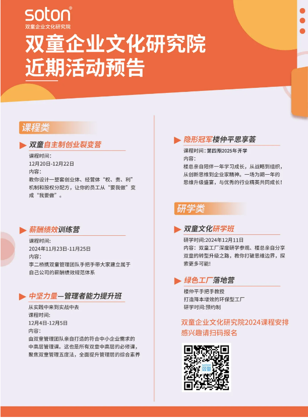 個體的進化是組織進化的前提,創(chuàng)業(yè)者的“成長活性”驅(qū)動著企業(yè)的“成長活性”。所以樓仲平個人的持續(xù)進化,也推動了雙童這家企業(yè)在30年間,不斷穿越一個個經(jīng)營周期,并持續(xù)充滿活力!