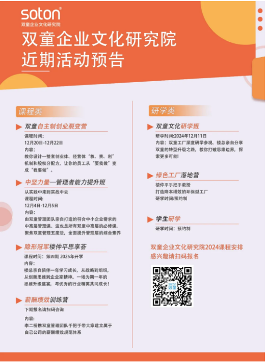 如果你也對“雙童”充滿好奇,也想賦能團隊共同成長,歡迎走進12月11日【雙童文化研學班】,與上百位優(yōu)秀的創(chuàng)業(yè)者一起學習!少量名額,歡迎咨詢鎖定!