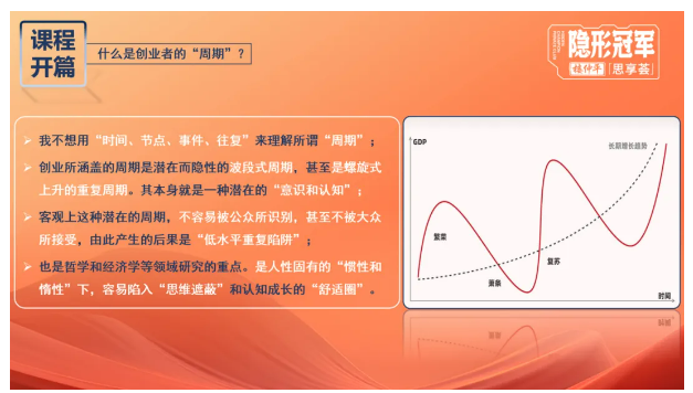 在良好的課堂氛圍下,樓老師的知識分享格外激情澎湃。為了讓大家更好地理解主題,在課程伊始,樓老師闡釋了“創(chuàng)業(yè)者周期”的定義,創(chuàng)業(yè)所涵蓋的周期是潛在而隱性的波段式周期,甚至是螺旋式上升的重復周期。