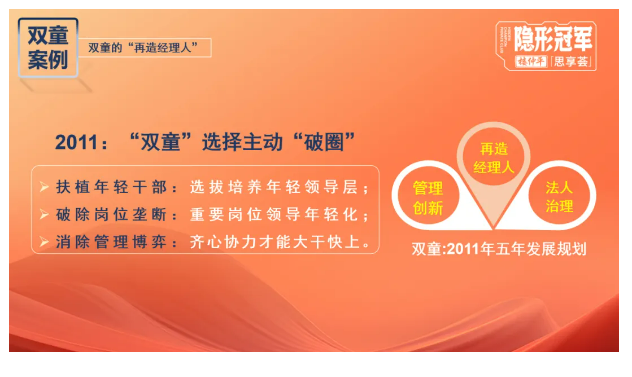 作為中國細分行業(yè)隱形冠軍企業(yè),“雙童”30年持續(xù)的創(chuàng)新和轉型,經歷了從“作坊企業(yè)—專精特新--隱形冠軍—第二曲線”的全生命發(fā)展周期,更懂得中小企業(yè)在“隱形冠軍”之路中各個階段遇到的痛點、難點。