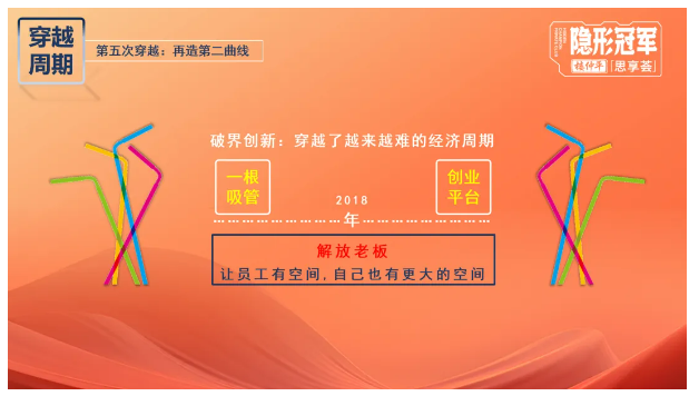 在危機之下,他毅然帶領“雙童”突破“一根吸管”的局限,突破路徑依賴,打開組織邊界,通過不斷嘗試摸索,獨創(chuàng)了一套適合中小企業(yè)的裂變增長的創(chuàng)新模式:將主業(yè)板塊作為創(chuàng)業(yè)共享平臺,拓展“第二曲線”反哺主業(yè)經營。