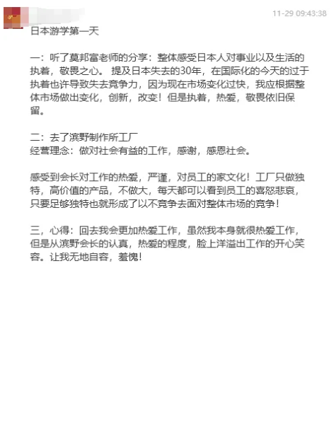 對(duì)于企業(yè)研學(xué)要學(xué)什么,他也提出了自己的建議:“看無(wú)形、觀(guān)無(wú)形”。比起硬件設(shè)施,在企業(yè)管理上學(xué)習(xí)日本企業(yè)的匠心精神和落地精益管理理念才更有長(zhǎng)期價(jià)值!這也讓同學(xué)們更明確了在接下來(lái)的入企研學(xué)中要怎么看,看什么。