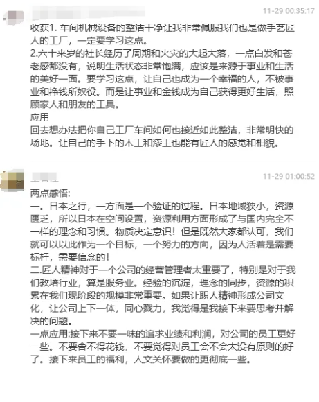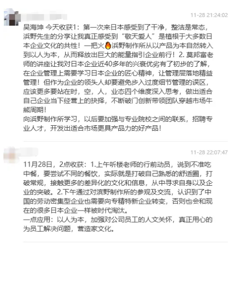 所以,在第一天的研學(xué)結(jié)束之后,同學(xué)們不僅收獲了很多關(guān)于產(chǎn)品創(chuàng)新、精細(xì)化管理等企業(yè)經(jīng)營(yíng)的新靈感,對(duì)自身企業(yè)未來(lái)的經(jīng)營(yíng)方向也有了不一樣的感觸: