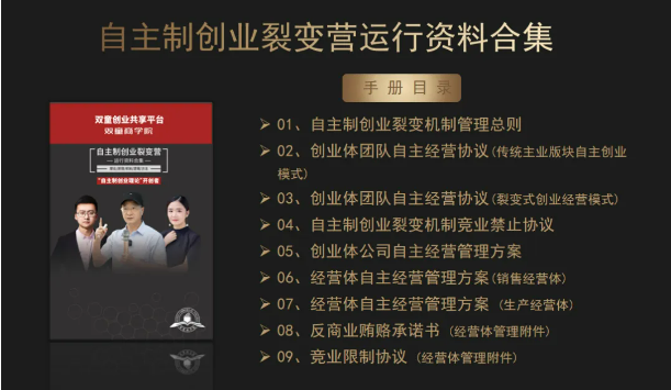 3、交付自主制創(chuàng)業(yè)裂變模式的各項(xiàng)規(guī)則、文本、合同等書面資料