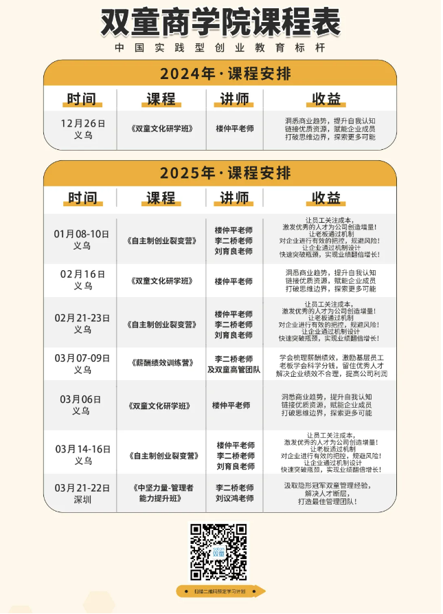 如果你也對(duì)“雙童”充滿好奇,也想賦能團(tuán)隊(duì)共同成長(zhǎng),歡迎走進(jìn)12月26日【雙童文化研學(xué)班】,與上百位優(yōu)秀的創(chuàng)業(yè)者一起學(xué)習(xí),也是年前最后一期,抓住機(jī)會(huì)哦!