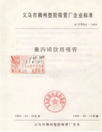 雙童的第一件企業(yè)標準是在1998年4月30日發(fā)布的,也是中國的第一份吸管標準。那時候義烏的小商品普遍以低、小、散、弱為特點,但是雙童沒有隨波逐流,堅持走標準化之路,后來又做了產(chǎn)業(yè)標準、地方標準、國家標準,包括國際標準。雙童第一件企業(yè)標準,目前已被義烏市博物館收藏展出