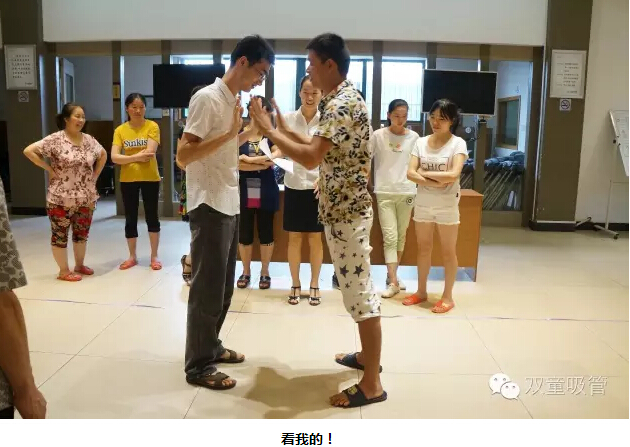 “太極推推樂?這個(gè)游戲是讓每組夫妻派出一人應(yīng)戰(zhàn)。對抗的兩人面對面站立,雙方相互之間輕推對方的手掌,對方的腳最先離開原來站立的點(diǎn),誰就輸了。快看!我們的妻子們可賣力啦,丈夫們也毫不示弱,場面可真是熱鬧呀!