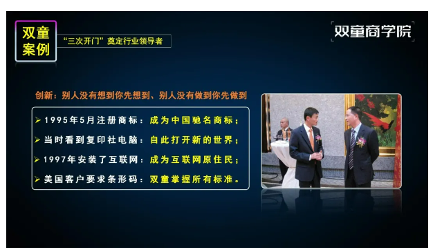 如果你也對“雙童”充滿好奇,也想讓企業(yè)成為行業(yè)的領(lǐng)導(dǎo)者,歡迎走進(jìn)3月12日【雙童文化研學(xué)班】,與上百位優(yōu)秀的創(chuàng)業(yè)者一起學(xué)習(xí)!少量名額,歡迎咨詢鎖定!