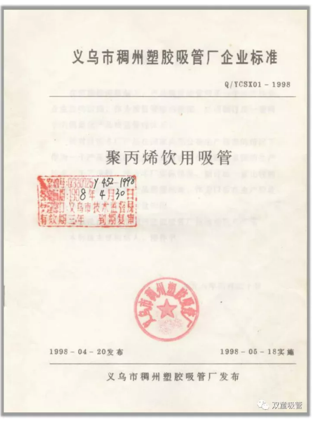 終于,在1997年10月,由“雙童”前身義烏市稠州塑膠吸管廠起草的Q/YCSX01《聚丙烯飲用吸管》企業(yè)標(biāo)準(zhǔn)審核通過,于1998年4月正式發(fā)布,成為吸管行業(yè)最早的產(chǎn)品標(biāo)準(zhǔn)。