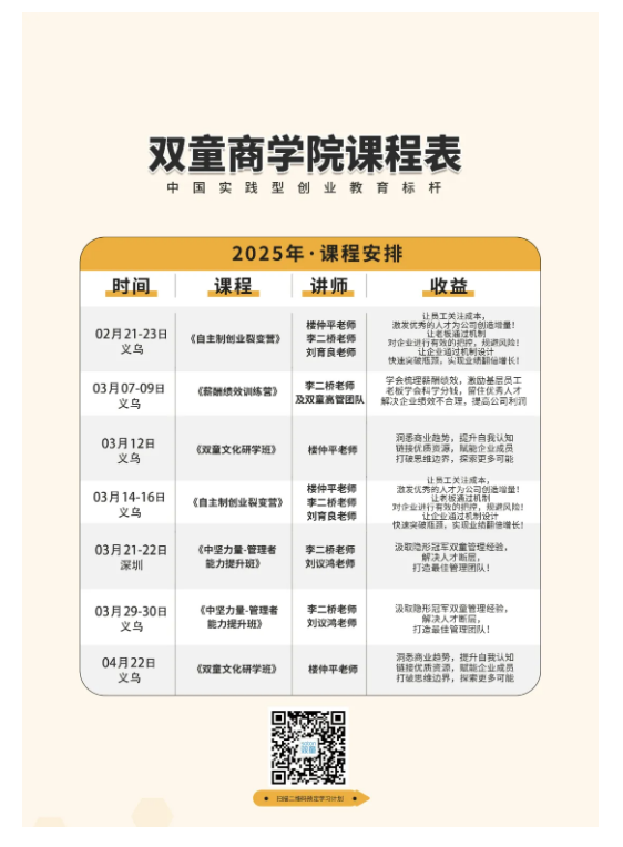 前文所述的雙童先后三次“開門”的經(jīng)歷只是《雙童文化研學(xué)班》創(chuàng)始人樓仲平主題課程分享的精彩片段。分享介紹后,樓總還將以問答互動的形式為學(xué)員們解答參觀過程中疑惑、或者企業(yè)發(fā)展中遇到的問題,讓大家在研學(xué)活動中避免走馬觀花,真正找到“雙童”經(jīng)營過程中的科學(xué)管理邏輯,實(shí)現(xiàn)創(chuàng)業(yè)思維的升階!