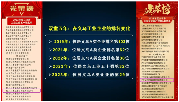 正是因?yàn)橛羞@樣一套完整的且不斷迭代、進(jìn)化的自主創(chuàng)業(yè)裂變機(jī)制,“雙童”在近幾年時(shí)間突飛猛進(jìn),并于2023年成功登榜“義烏A類(lèi)企業(yè)第29名”及“義烏市工業(yè)企業(yè)50強(qiáng)”!