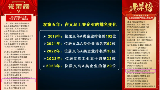 2月12日,義烏市人民政府網(wǎng)公布了“2024年度工業(yè)企業(yè)50強(qiáng)”名單,雙童創(chuàng)業(yè)共享平臺(tái)第一創(chuàng)業(yè)體(雙童日用品有限公司)與2023年蟬聯(lián)同榜同序,位居第32位!