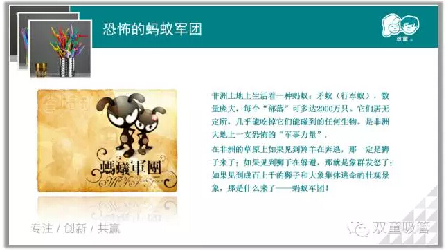 在進(jìn)行了游戲互動(dòng)之后,我們的課程也正式開始啦!何為團(tuán)隊(duì)力量?接下來吸管妞通過恐怖的螞蟻軍團(tuán)和楚漢相爭(zhēng)的兩個(gè)小故事和我們講解了團(tuán)隊(duì)的力量。與伙伴精誠協(xié)作,才能變得更強(qiáng)大。