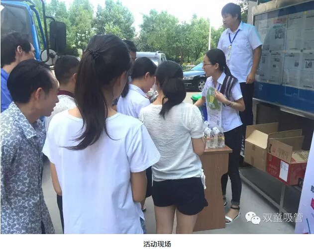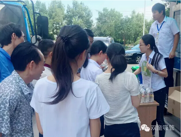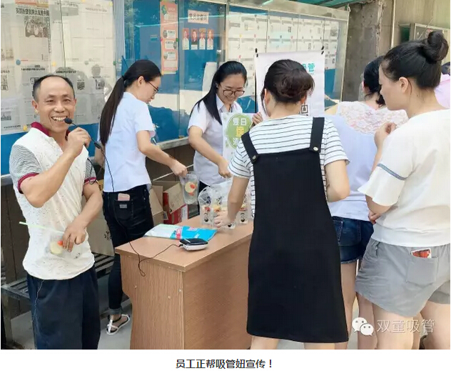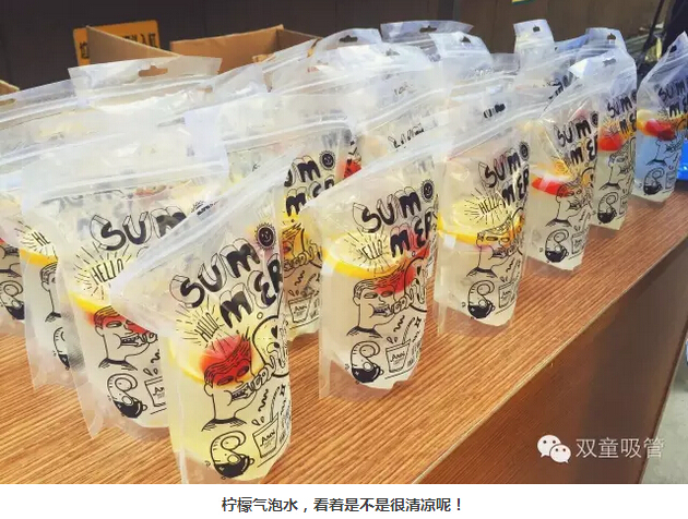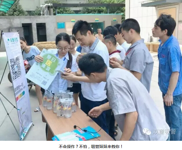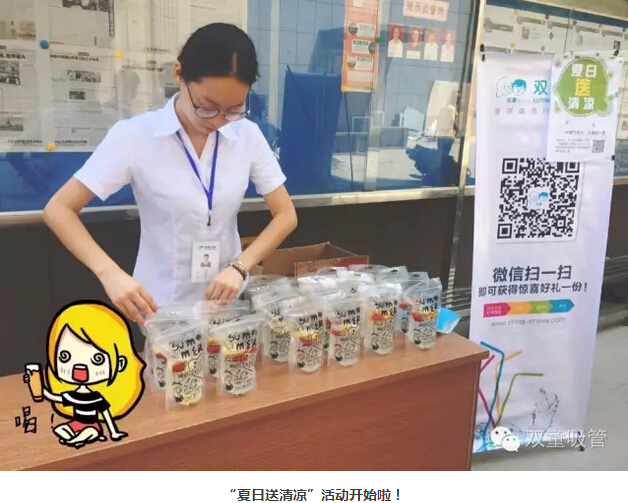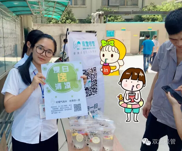 瞧!我們剛開張,就吸引了不少正要去吃飯的員工們。原來,拿到飲料的方法特別簡(jiǎn)單,只需要關(guān)注雙童吸管的微信公眾平臺(tái)并轉(zhuǎn)發(fā)微信,即可獲得檸檬氣泡水一袋呢!看來吸管妞為了微信的推廣也是絞盡腦汁啦!