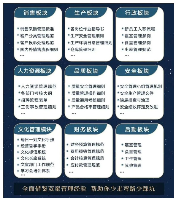入學(xué)“隱形冠軍樓仲平思享薈”之后,你將獲得“雙童”積累了31年、包含了銷售、生產(chǎn)、行政、人力資源、品質(zhì)、安全、文化管理、財(cái)務(wù)和后勤等9大板塊,600份管理規(guī)范文件,可以幫助企業(yè)全面借鑒雙童管理經(jīng)驗(yàn)、少走彎路、少踩坑!