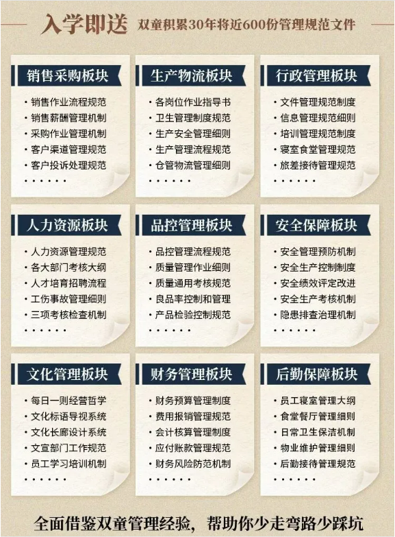 所以,入學“隱形冠軍樓仲平思享薈”之后,項目組會將“雙童”積累了31年、包含了銷售、生產、行政、人力資源、品控、安全、文化管理、財務和后勤等9大板塊,近600份管理規(guī)范文件,全部打包給學員,幫助學員企業(yè)能夠全面借鑒雙童管理經驗、少走彎路、少踩坑!