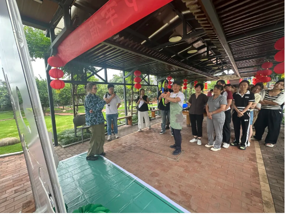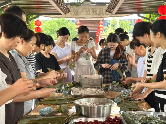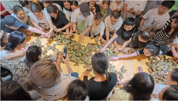 由于各個(gè)崗位的年輕人都沒(méi)有親自做過(guò)粽子,手忙腳亂地做出來(lái)的粽子始終不成型。樓總便趕忙邀請(qǐng)了他的幾位親戚過(guò)來(lái)做“指導(dǎo)老師”,現(xiàn)場(chǎng)手把手傳承包粽子手藝。