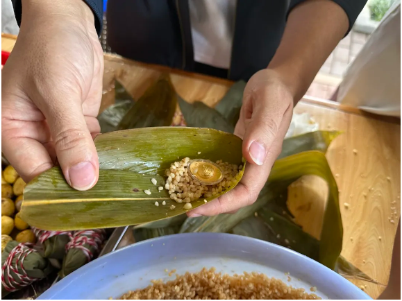 重頭戲來(lái)啦,黃金元寶餡料已就位!大家一起目睹它們被包進(jìn)香糯米里,可惜時(shí)間太短,完全記不住這幾個(gè)粽子的外貌特征就已經(jīng)要開(kāi)始煮了。