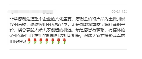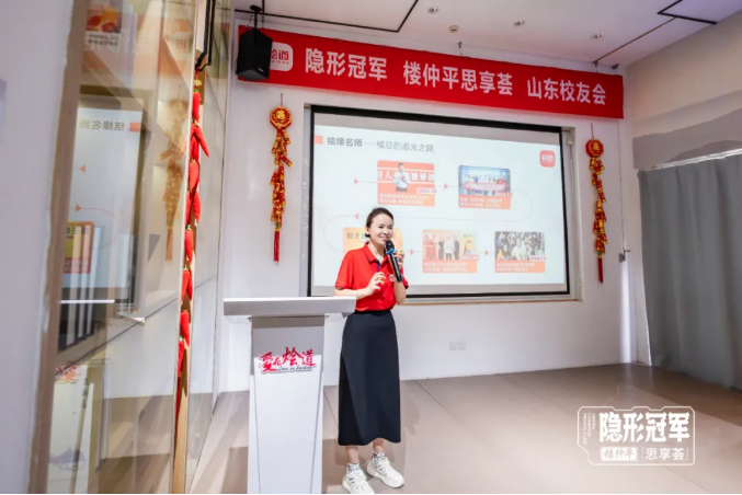 在專題分享環(huán)節(jié),燴道運營總經(jīng)理吳春云先是介紹了與雙童的結(jié)緣之路。2024年在山東淄博的一次活動上,吳總首次聽到樓仲平老師的分享,被他的經(jīng)營理念所深深吸引,先后帶領(lǐng)公司小伙伴超30人次走進雙童研學(xué)以及深度學(xué)習(xí)自主創(chuàng)業(yè)裂變機制。