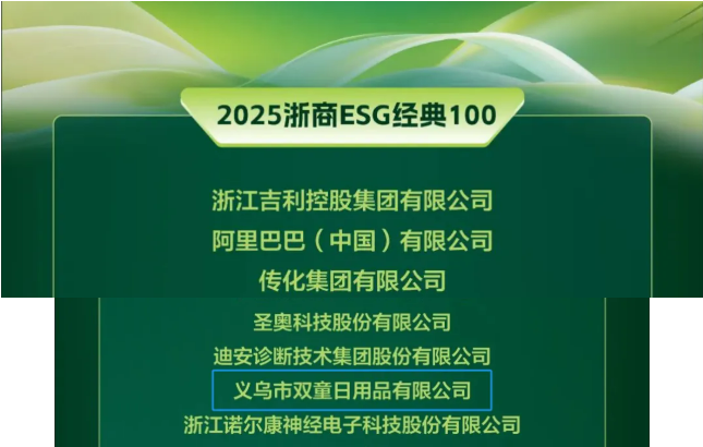 7月30日,2025浙商ESG大會上隆重發(fā)布“2025浙商ESG經典100”,其中,雙童再次憑借在ESG領域取得的卓越表現(xiàn)成功入圍!