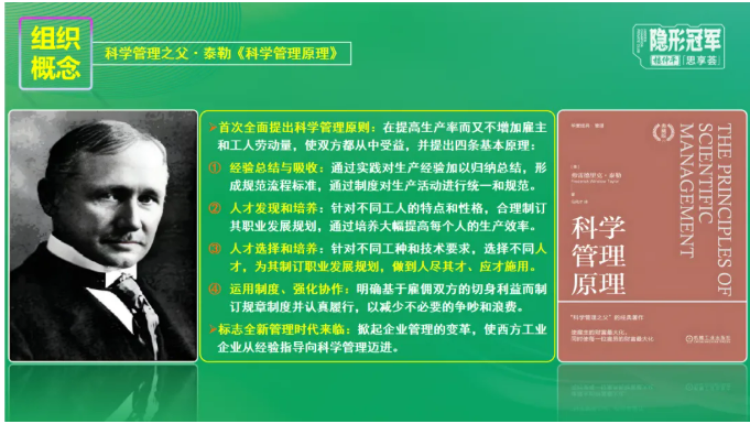 科學(xué)管理之父泰勒《科學(xué)管理原理》一書中,首次全面提出科學(xué)管理原則在提高生產(chǎn)率而又不增加雇主和工人勞動量,使雙方都從中受益。這標(biāo)志全新管理時代的來臨。