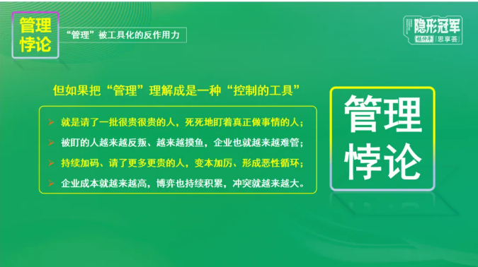 “管”與“理”組合,決定了組織“控制職能“和“協(xié)調(diào)職能”的兩大基本職能。然而,很多人會陷入到“管理悖論”,將其簡單理解為一種“控制的工具”。那么所謂“管理”何為正確?查爾斯·漢迪認(rèn)為,管理其核心就是基于對人性的尊重。