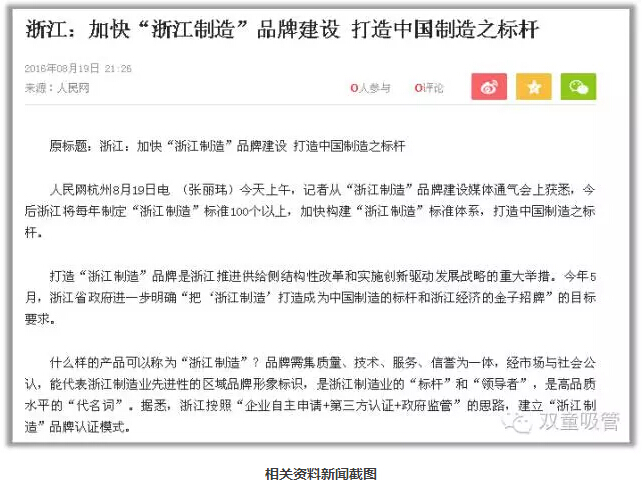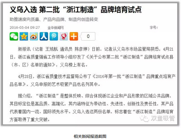 在2014年年底,浙江在全國率先以標準和認證為手段打造首個區(qū)域性公共品牌——“浙江制造品牌。浙江制造標準比國家及行業(yè)標準要求要高,基本達到國際先進、國內(nèi)一流水平。428日,浙江省質(zhì)量技術(shù)監(jiān)督局公布《2016年第一批浙江制造品牌重點培育產(chǎn)品名單》,我們雙童代表義烏申報的吸管產(chǎn)品名列其中。入選這份名單,標志著義烏在浙江制造品牌培育方面取得了重大突破。