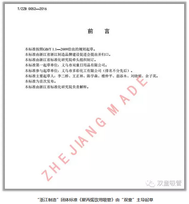 【義烏首件“浙江標準”正式發(fā)布!】“雙童”起草的《聚丙烯飲用吸管》“浙江制造”團體標準正式發(fā)布,“雙童”引領(lǐng)中國制造業(yè)轉(zhuǎn)型升級!