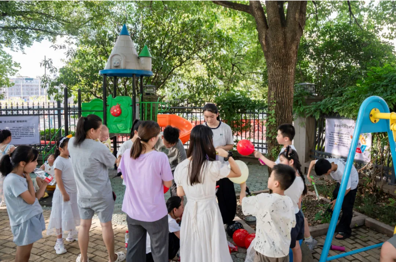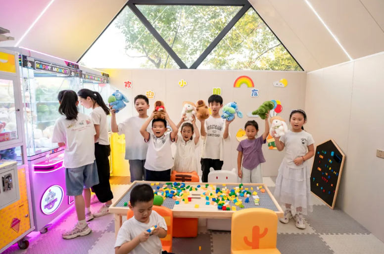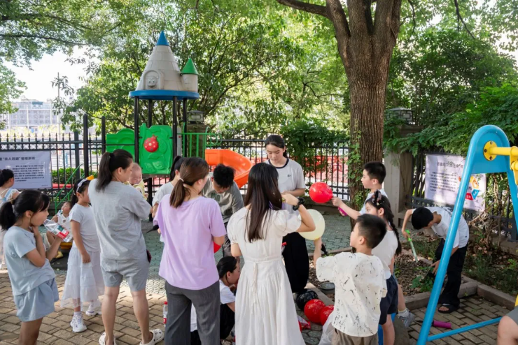 活動(dòng)現(xiàn)場(chǎng)充分利用了雙童的場(chǎng)地優(yōu)勢(shì):雙童一號(hào)樹的濃密樹蔭下,布置了兩個(gè)大充氣泳池和其他游戲設(shè)施;新建成的森林長(zhǎng)廊中,抓娃娃機(jī)、積木、課外書一應(yīng)俱全,儼然一個(gè)童趣小天地。小朋友們迅速沉浸在這場(chǎng)夏日盛宴中:泳池里水花四濺、笑語不斷,長(zhǎng)廊間專注抓娃娃、拼積木的身影隨處可見,一號(hào)樹下,各種趣味游戲也正熱烈進(jìn)行。