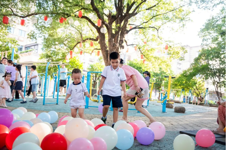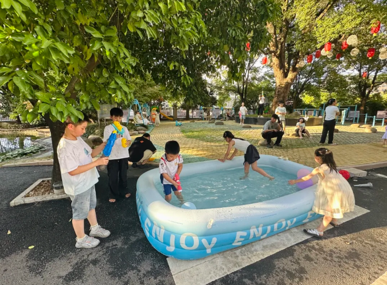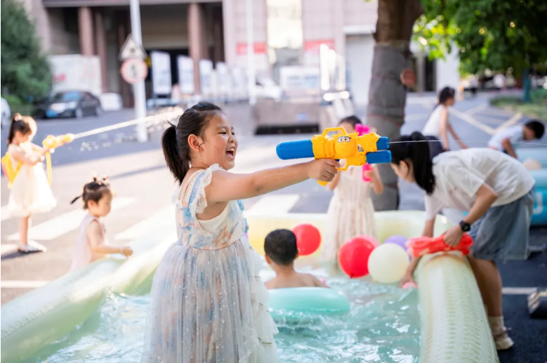 見到一旁裝飾的氣球,小朋友們靈光一閃,放了許多在泳池里,更添了幾分樂趣。他們迫不及待地跳進(jìn)水中,霎時(shí)間水花四濺、笑聲不斷,場(chǎng)面熱鬧非凡。大家不停地把手中的水槍裝滿水,三兩成群地追逐嬉戲。守在泳池里的小朋友則成了“固定據(jù)點(diǎn)”,仗著火力充足,不停地向周圍“開火”掃射。