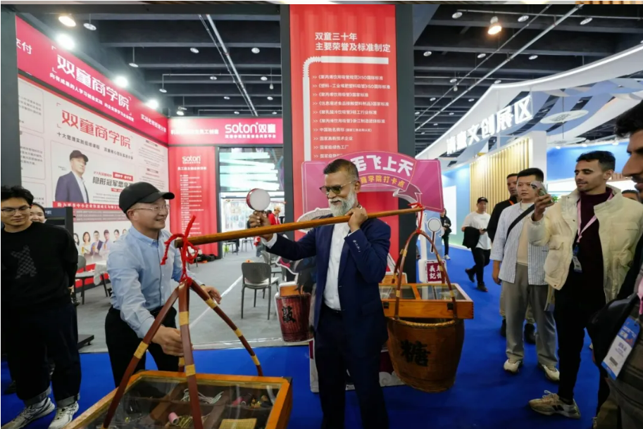展會(huì)現(xiàn)場(chǎng),雙童董事長(zhǎng)樓仲平親自挑起貨郎擔(dān),重現(xiàn)"雞毛換糖"的歷史場(chǎng)景,將義烏深厚的商業(yè)傳統(tǒng)與當(dāng)代展會(huì)完美融合。隨著撥浪鼓聲響起,各國(guó)客商紛紛駐足,踴躍參與這場(chǎng)跨越時(shí)空的體驗(yàn),在互動(dòng)中感受義烏商業(yè)精神的傳承與創(chuàng)新。