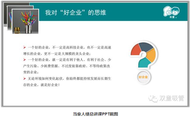 當(dāng)家人樓總答:大家總認(rèn)為大的發(fā)展快的企業(yè)才是好企業(yè)。其實(shí)企業(yè)要活著,持續(xù)的產(chǎn)出產(chǎn)品,并且產(chǎn)品越做越好才是一個好企業(yè),好的企業(yè)是不斷滿足消費(fèi)者需求的企業(yè)!