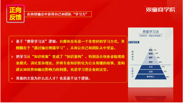 IP打造的過程,也是團(tuán)隊(duì)學(xué)習(xí)力提升的過程?;谫M(fèi)曼學(xué)習(xí)法,持續(xù)的內(nèi)容輸出能倒逼輸入,讓創(chuàng)業(yè)者與團(tuán)隊(duì)在梳理商業(yè)模式、消化專業(yè)知識(shí)、轉(zhuǎn)化公眾語言的過程中,實(shí)現(xiàn)“知識(shí)重構(gòu)”而非單純的“知識(shí)收集”。雙童文宣團(tuán)隊(duì)的成長(zhǎng),正是這一邏輯的生動(dòng)體現(xiàn)。