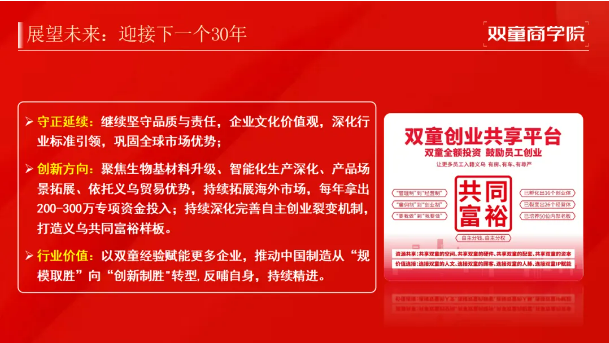 除此之外,雙童在2020年成立“雙童創(chuàng)業(yè)共享平臺”,引導(dǎo)員工突破主業(yè)邊界,孵化內(nèi)部員工成為經(jīng)營者和創(chuàng)業(yè)者,實現(xiàn)“二次價值挖掘”,實現(xiàn)從“管控”到“賦能”的轉(zhuǎn)變。