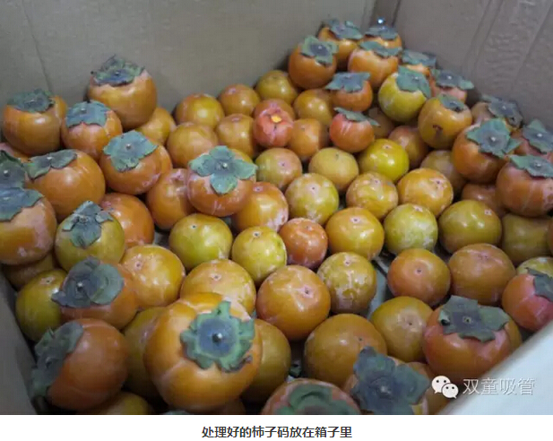 采摘下來的柿子將枝椏剪掉,再涂抹上一點藥酒,整齊地碼放在箱子里,密封三四天,柿子們就澀味盡除,甘甜如蜜啦!
