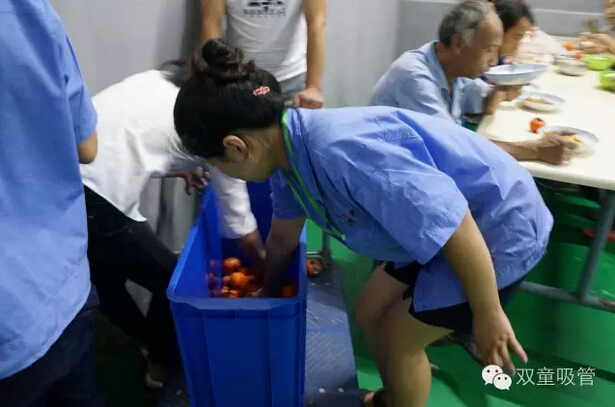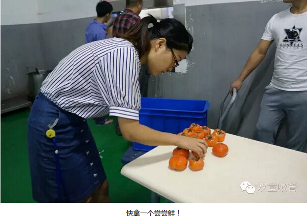 吸管妞忍不住嘗了嘗剛熟透的柿子,真是甜如蜜呀!啥都別說了,趕緊拿去食堂給所有員工分一分。一聽說有甜柿子可吃,這可樂壞了大伙,全都湊上來嘗嘗鮮!別急別急,一人一個,都能吃到!