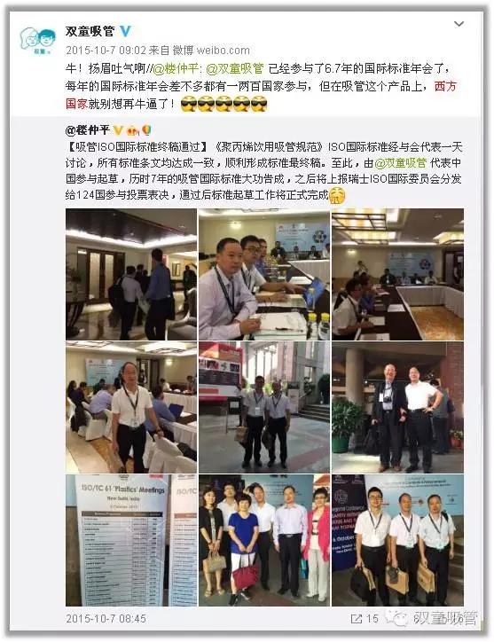蘇州年會的分組討論會上,雙童得到了國標(biāo)委全國塑料制品標(biāo)準(zhǔn)化技術(shù)委員會(TC48)和省市技術(shù)監(jiān)督局相關(guān)領(lǐng)導(dǎo)專家的大力支持,大家齊心協(xié)力,共同與成員國代表講道理、擺事實(shí),運(yùn)用大量的數(shù)據(jù)和檢測結(jié)果來說服標(biāo)準(zhǔn)條文的合理性和科學(xué)性,并在主席國各方同意一致的前提下形成了《聚丙烯飲用吸管規(guī)范》ISO國際標(biāo)準(zhǔn)的初審稿。蘇州年會分組討論形成的初審稿,意味著由雙童提交的標(biāo)準(zhǔn)條文已經(jīng)基本定稿,也意味著全球吸管行業(yè)的國際標(biāo)準(zhǔn)將全部采用雙童提交的中國標(biāo)準(zhǔn)。
