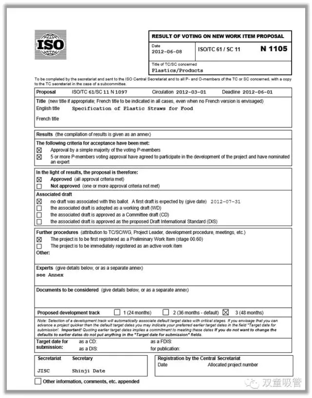 ISO國際標(biāo)準(zhǔn)化組織下發(fā)的《聚丙烯飲用吸管規(guī)范》標(biāo)準(zhǔn)任務(wù)書