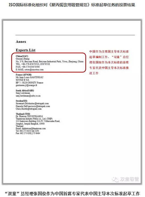 2016627日,瑞士ISO標(biāo)準(zhǔn)化管理組織正式向全球162個成員國下發(fā)了《聚丙烯飲用吸管規(guī)范》ISO國際標(biāo)準(zhǔn)文本。至此,歷經(jīng)九年,輾轉(zhuǎn)六國,由雙童代表中國主持起草的《聚丙烯飲用吸管規(guī)范》ISO國際標(biāo)準(zhǔn)終于大功告成!標(biāo)準(zhǔn)起草編制工作圓滿完成。