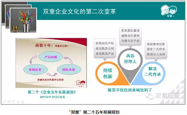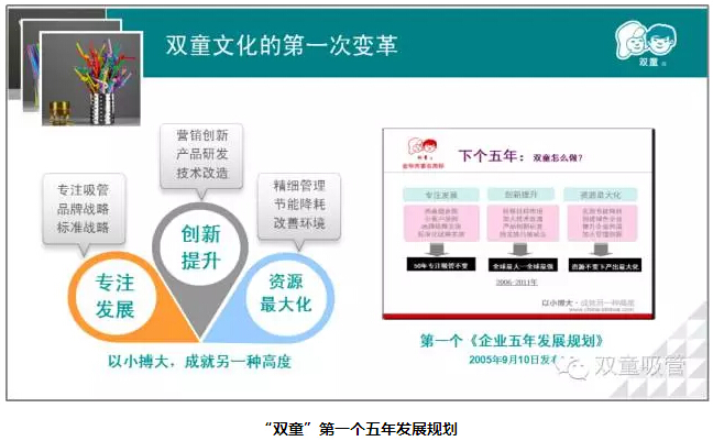 為了讓雙童更加堅守實業(yè),2005雙童出臺了第一個五年發(fā)展規(guī)劃,其中就提到了專注發(fā)展,不是立下雄心壯志,而是做減法;2011年又出臺了第二個五年發(fā)展規(guī)劃,通過產(chǎn)品創(chuàng)新、團隊再造、體制改革三個方面進行發(fā)展。