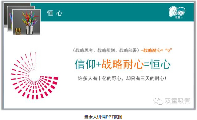當家人樓總談到自己時說:一輩子精力有限,把一根吸管真正做好就行了。” “雙童堅持走專業(yè)化的發(fā)展道路,堅守實業(yè),不多元,不浮躁,不急功近利,強調(diào)以小博大不是拼搏的搏,而是博大的博,就是要以博大的胸懷將一根吸管做精、做強、做到極致。